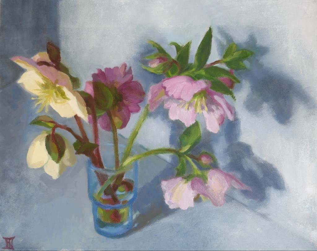 I always find painting flowers from life a joy. They never keep still and as they drink and move towards the light source they remind you that they are living creatures responding to their surroundings. There is something engaging about the fragility of the flowers and how their beauty can only be appreciated for a relatively short time. I tried to keep the colours as fresh as possible and did not want the background to interfere with the subject.